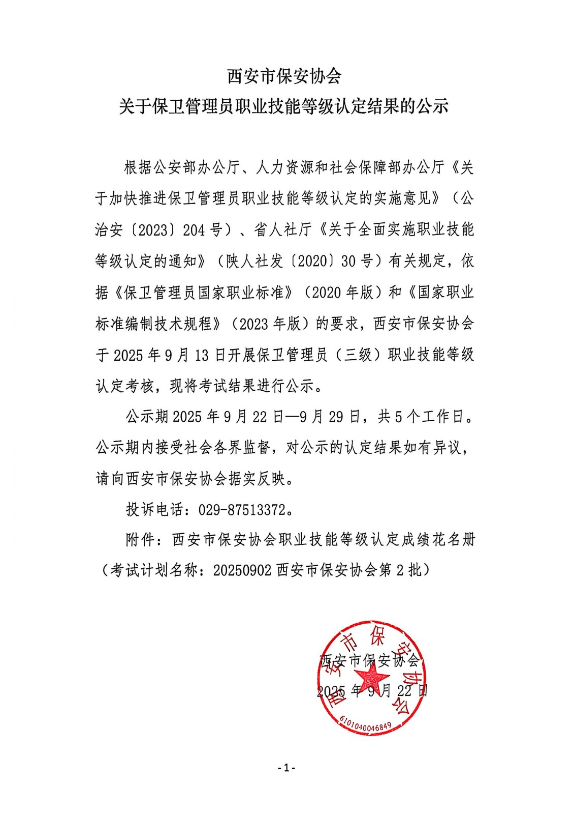 关于保卫管理员职业技能等级认定结果的公示(2025年第2批)